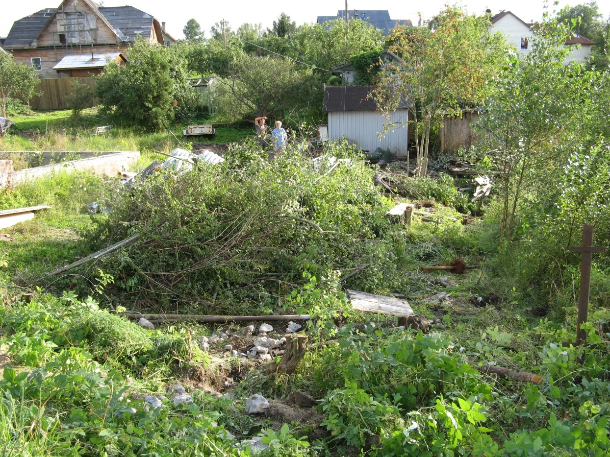 Участок с большим перепадом высоты от дороги к сарайчику. Старая дренажная система в нерабочем состоянии. Остался фундамент от старого дома заказчика. Участок не огорожен, много мусора и зарослей.